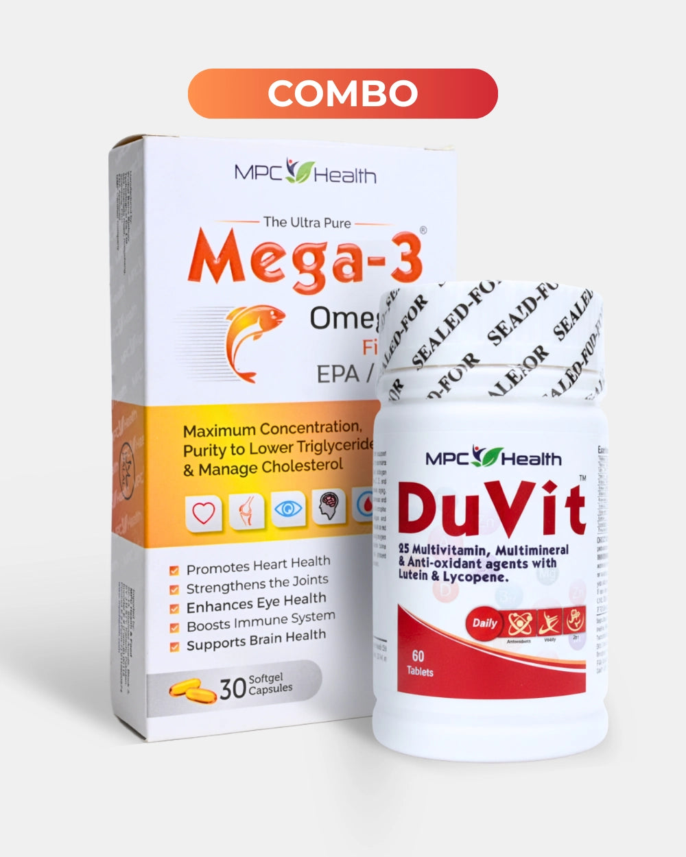 Duvit 60 provides essential vitamins and minerals that many people are low in. It helps reduce tiredness, supports immunity, and keeps your body functioning properly. Mega-3 contains high-quality omega-3 fatty acids (EPA and DHA) which support heart health, brain function, and reduce inflammation.