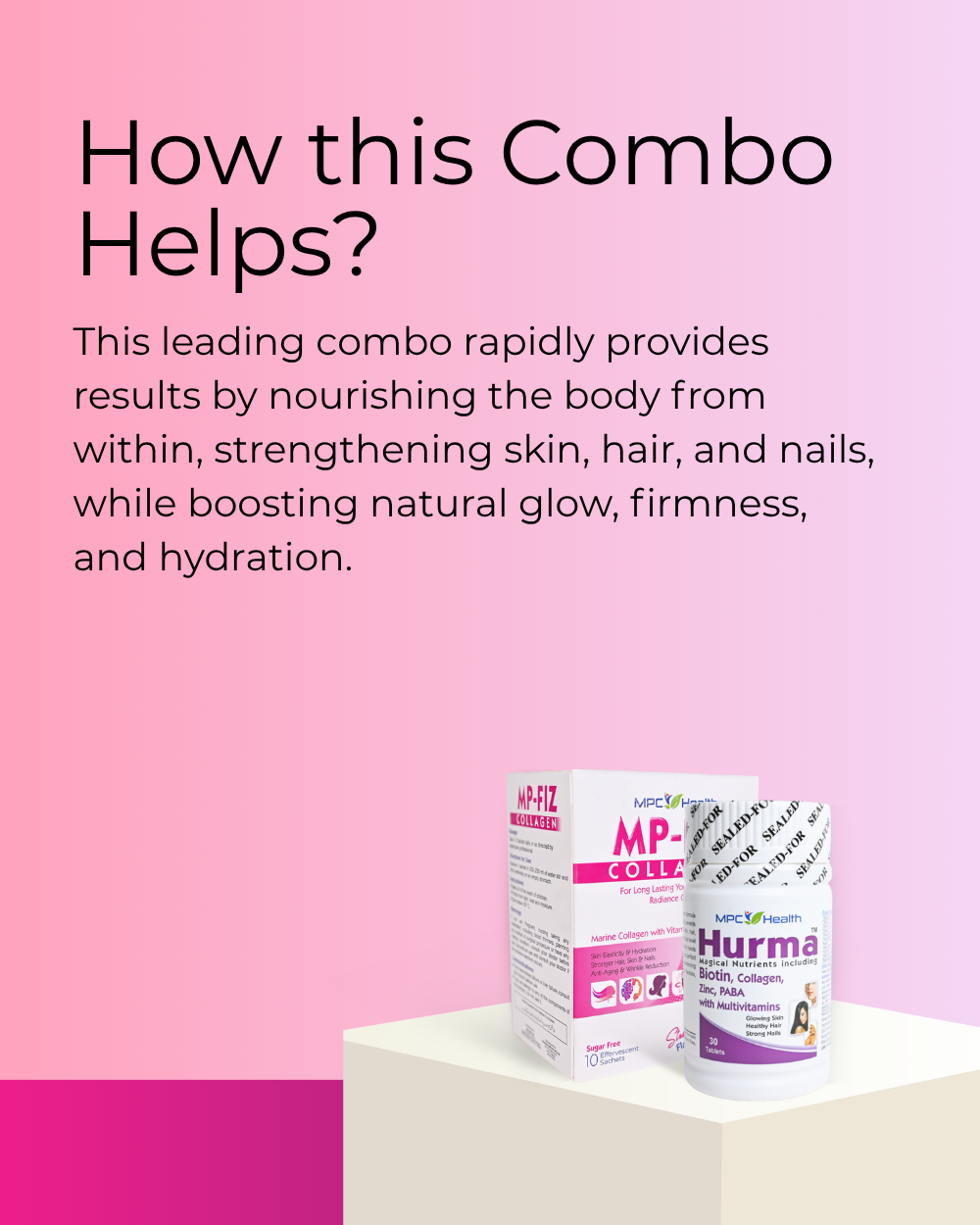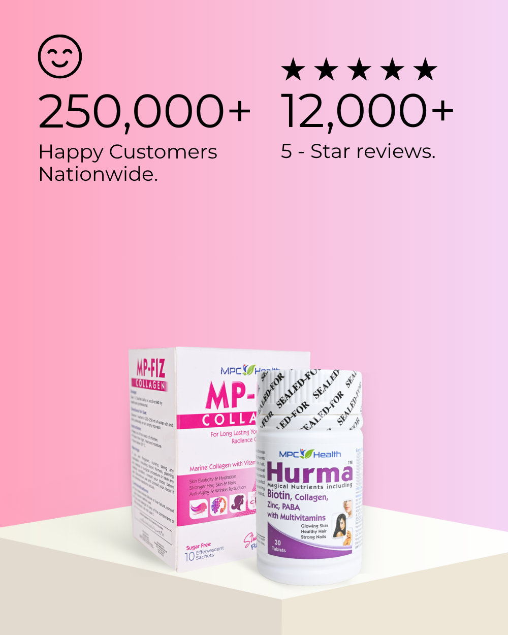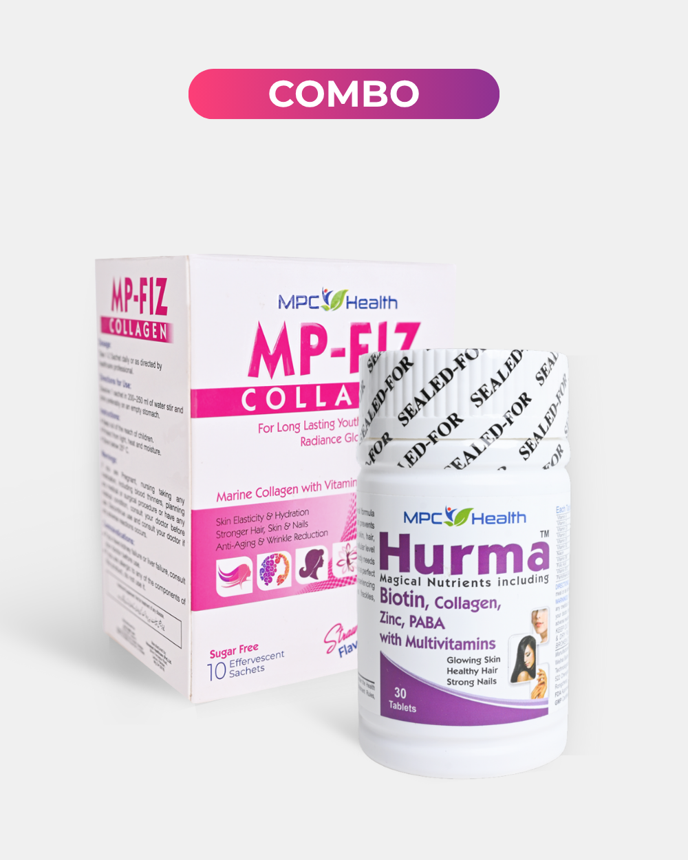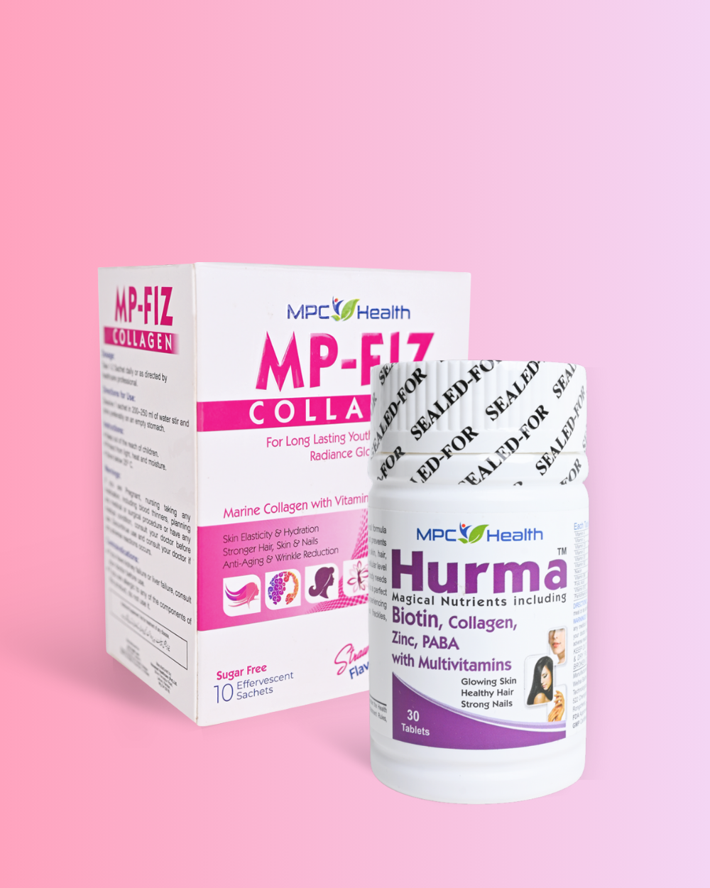 MP-Fiz Collagen revitalizes your skin from within with Marine Collagen Peptides and Vitamin C that boost elasticity, improve hydration, and reduce fine lines for a youthful glow. Hurma complements it with Biotin, Collagen, and essential vitamins that strengthen hair, nails, and skin while restoring natural shine and smoothness. Together, they nourish, protect, and renew your beauty from the inside out — giving you stronger hair, healthier skin, and lasting radiance.
