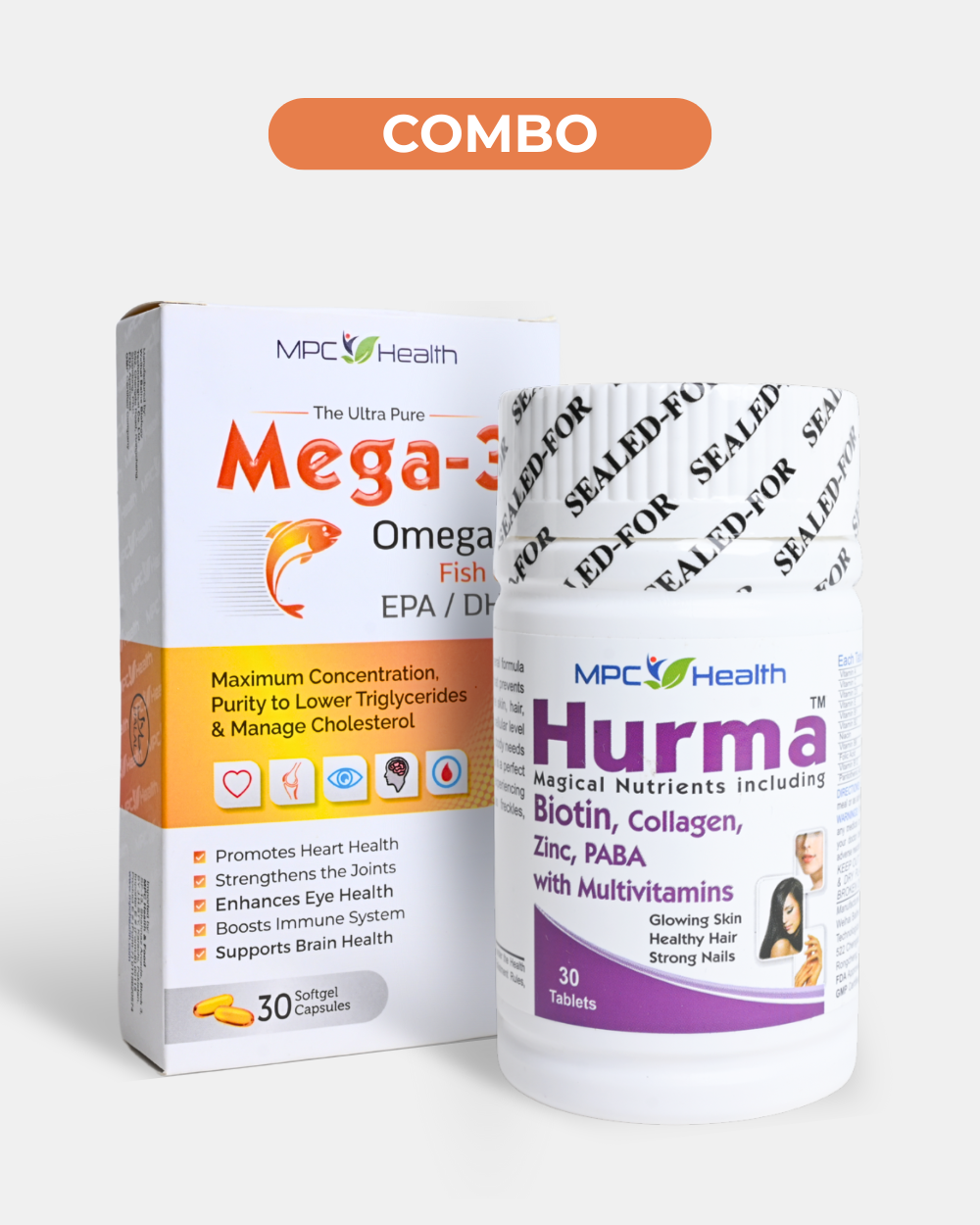 This combo is designed for complete beauty and wellness — healthier hair, glowing skin, stronger nails, and a healthier heart. With Hurma’s nutrient-rich formula and Mega-3’s omega power, it’s the perfect daily blend for looking good and feeling great.