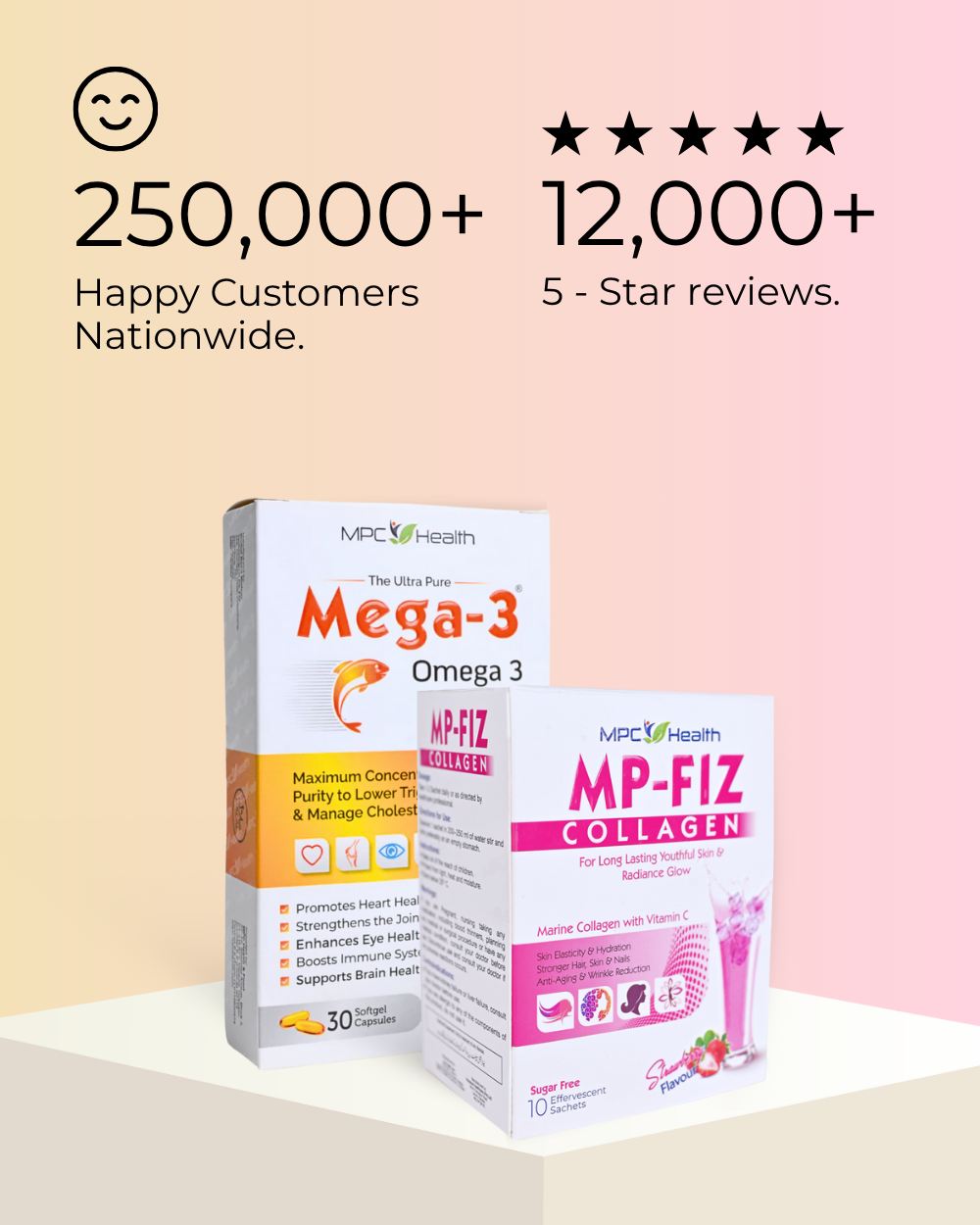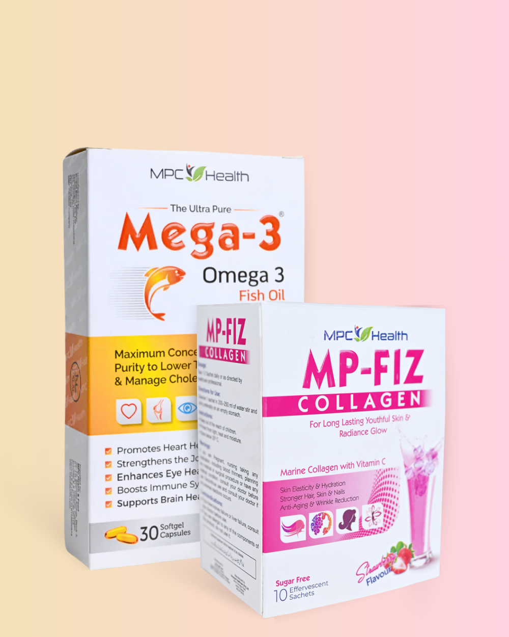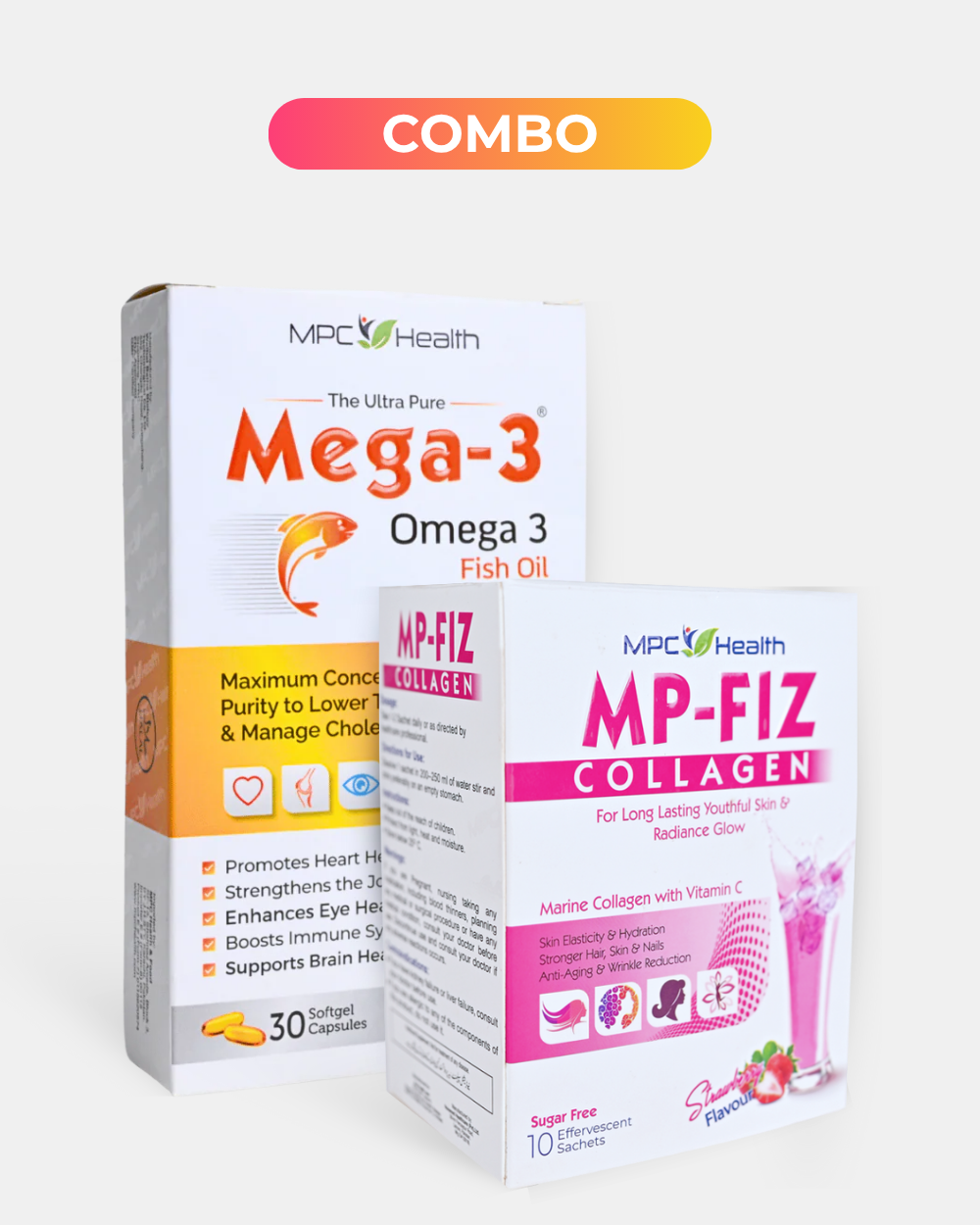 MP-Fiz Collagen enhances skin elasticity, hydration, and firmness with Marine Collagen and Vitamin C, helping you achieve a youthful glow. Mega-3 complements it with Omega-3 fatty acids that reduce inflammation, support skin barrier health, and promote heart and brain wellness. Together, they keep your skin smooth, your body energized, and your glow unstoppable.