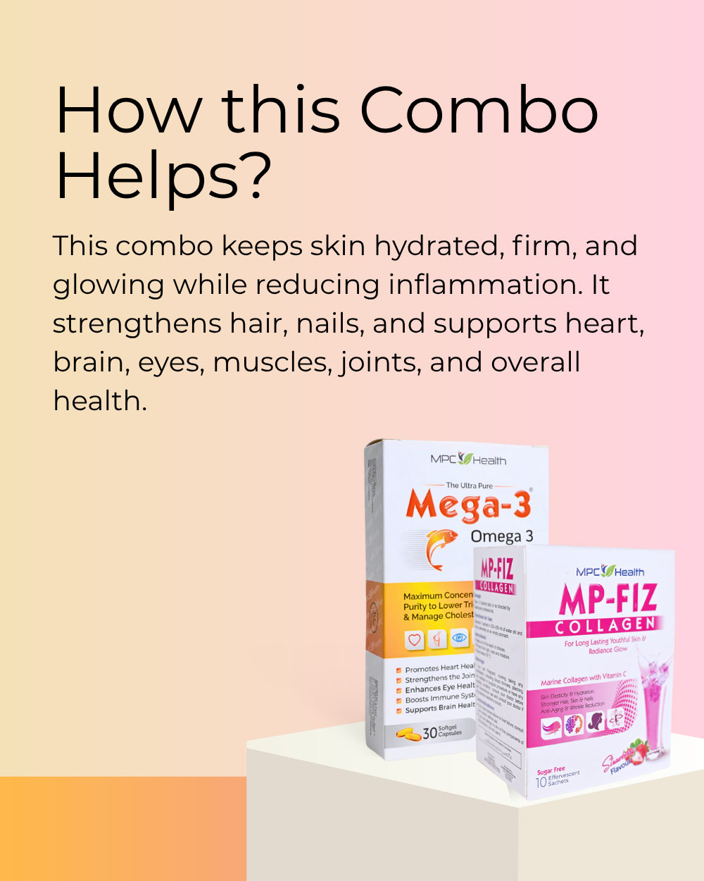 MP-Fiz Collagen works from within to hydrate, firm, and rejuvenate your skin with Marine Collagen Peptides and Vitamin C, helping restore a youthful glow. Mega-3 complements it with high-quality Omega-3 fatty acids (EPA & DHA) that support skin barrier function, reduce inflammation, and promote overall heart and brain health. Together, they enhance hydration, boost elasticity, and protect your skin from dryness and early aging, keeping you glowing and healthy from the inside out.