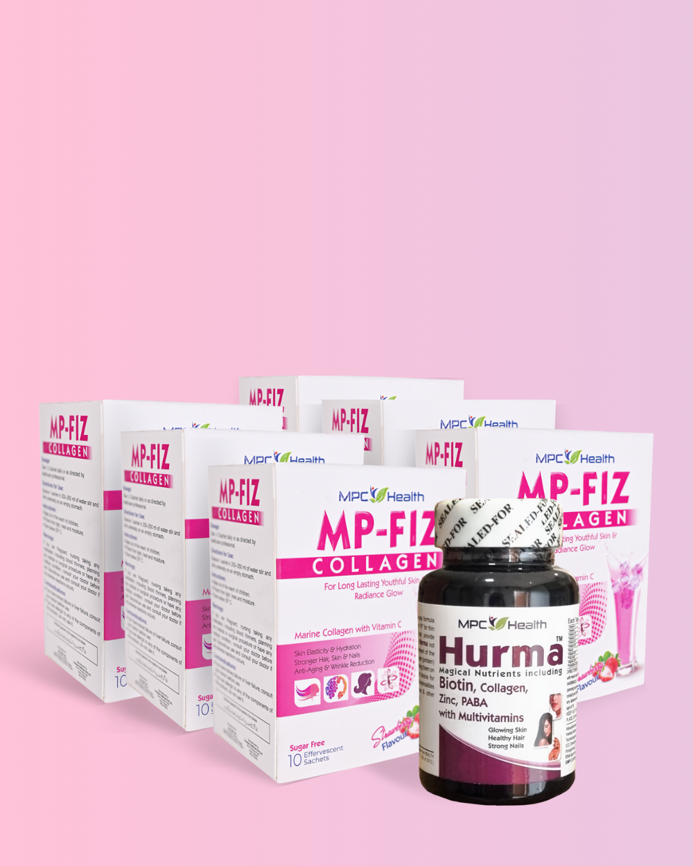 MP-Fiz Collagen revitalizes your skin from within with Marine Collagen Peptides and Vitamin C that boost elasticity, improve hydration, and reduce fine lines for a youthful glow. Hurma complements it with Biotin, Collagen, and essential vitamins that strengthen hair, nails, and skin while restoring natural shine and smoothness. Together, they nourish, protect, and renew your beauty from the inside out — giving you stronger hair, healthier skin, and lasting radiance.