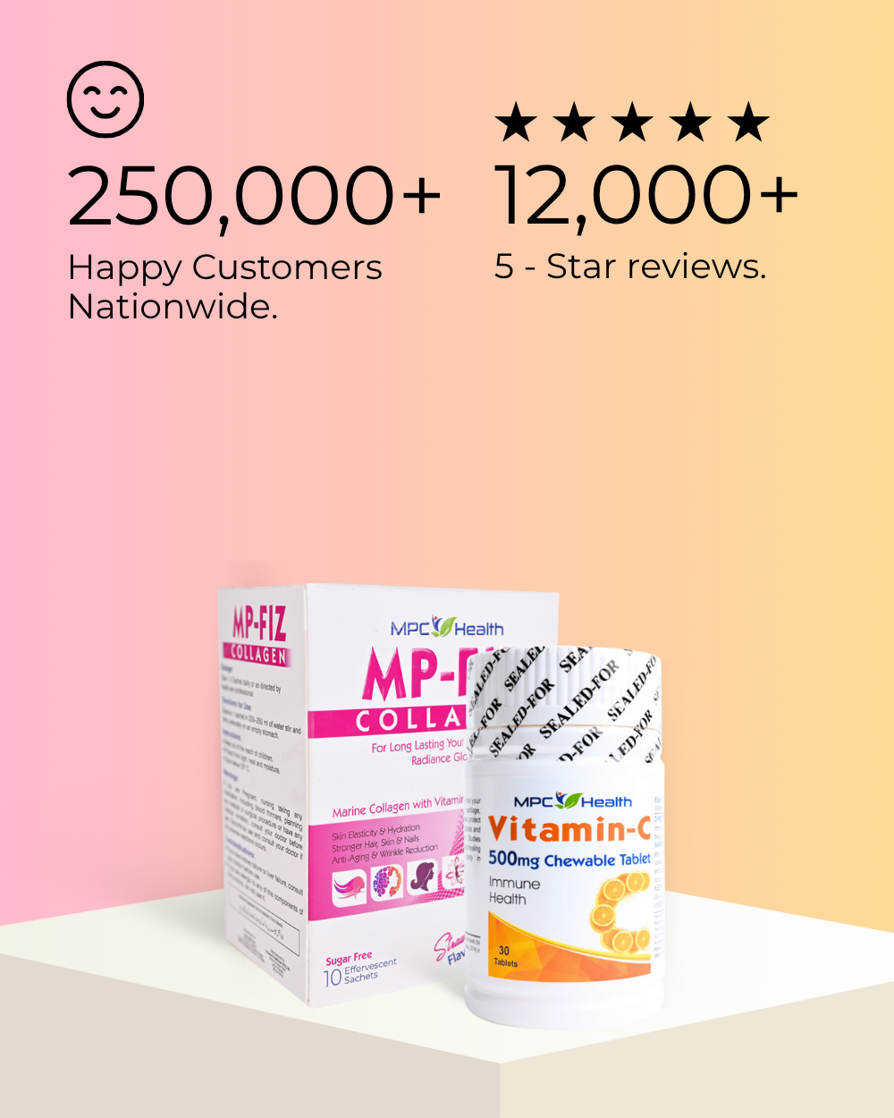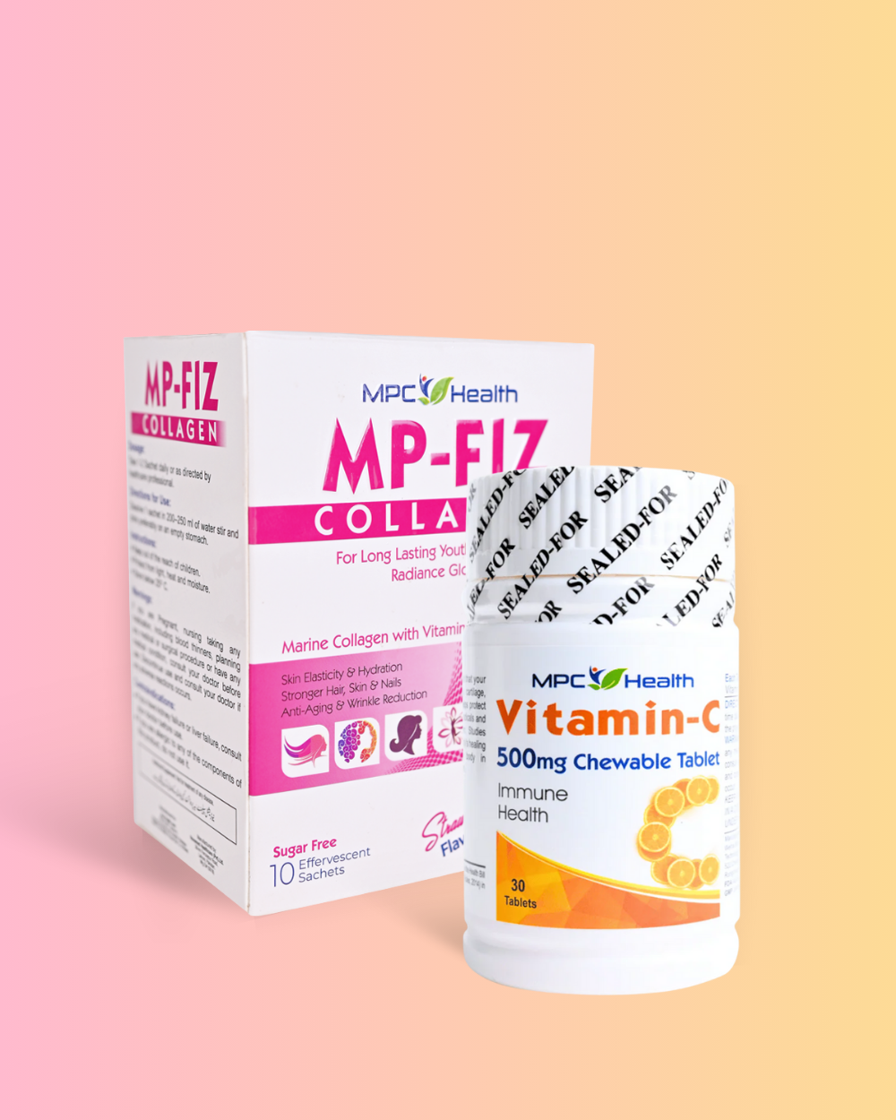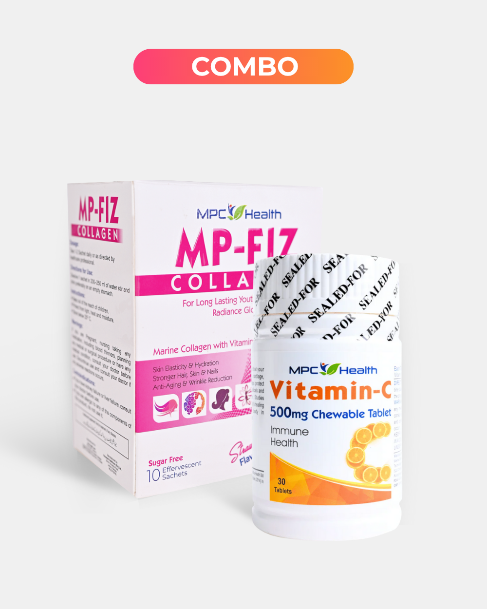 MP-Fiz Collagen works from within to hydrate, firm, and rejuvenate your skin with Marine Collagen Peptides and Vitamin C, helping restore a youthful glow. Vitamin C enhances the effects by boosting collagen production, improving skin texture, and fighting oxidative stress. Together, they hydrate, brighten, and firm the skin, reducing signs of aging.
