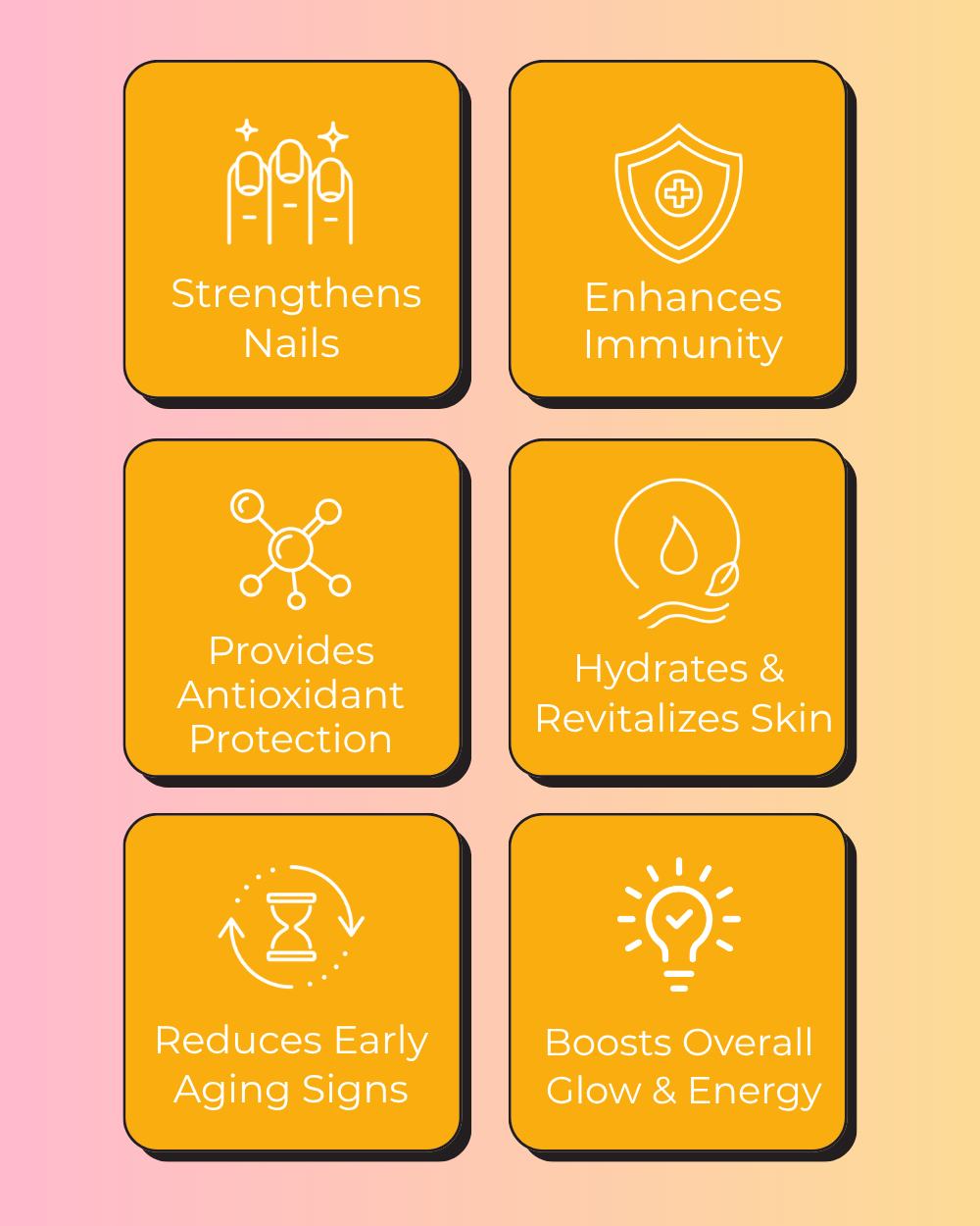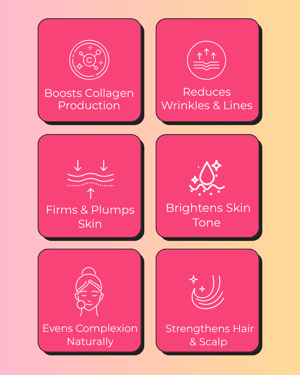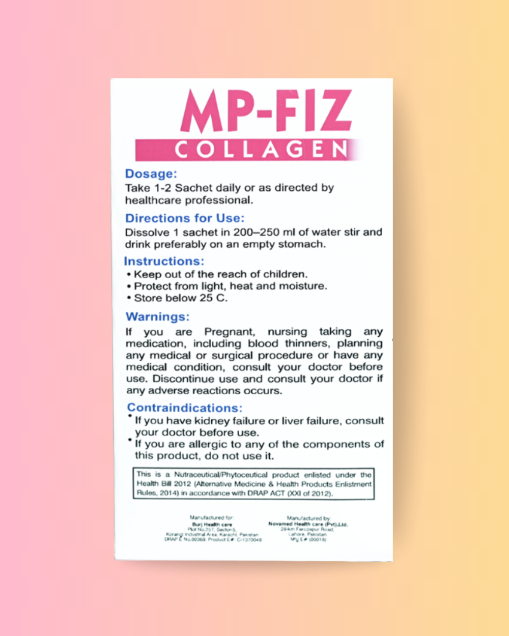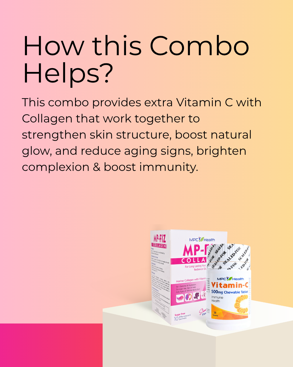 MP-Fiz Collagen works from within to hydrate, firm, and rejuvenate your skin with Marine Collagen Peptides and Vitamin C, helping restore a youthful glow. Vitamin C enhances the effects by boosting collagen production, improving skin texture, and fighting oxidative stress. Together, they hydrate, brighten, and firm the skin, reducing signs of aging.
