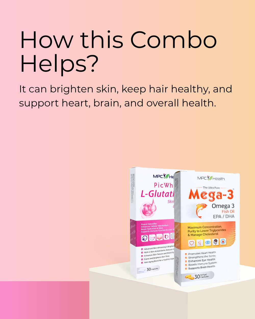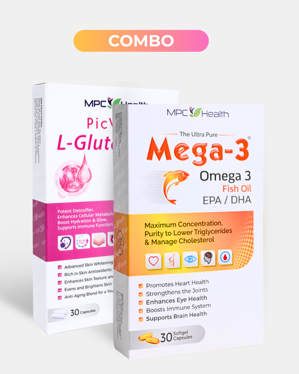 Pic White works from within to brighten skin, reduce pigmentation, and detoxify the body with a powerful blend of glutathione, Vitamin C, and antioxidants. Mega 3 complements it by providing essential omega-3 fatty acids (EPA & DHA) that reduce inflammation, support healthy cell function, and nourish the skin deeply from the inside out.