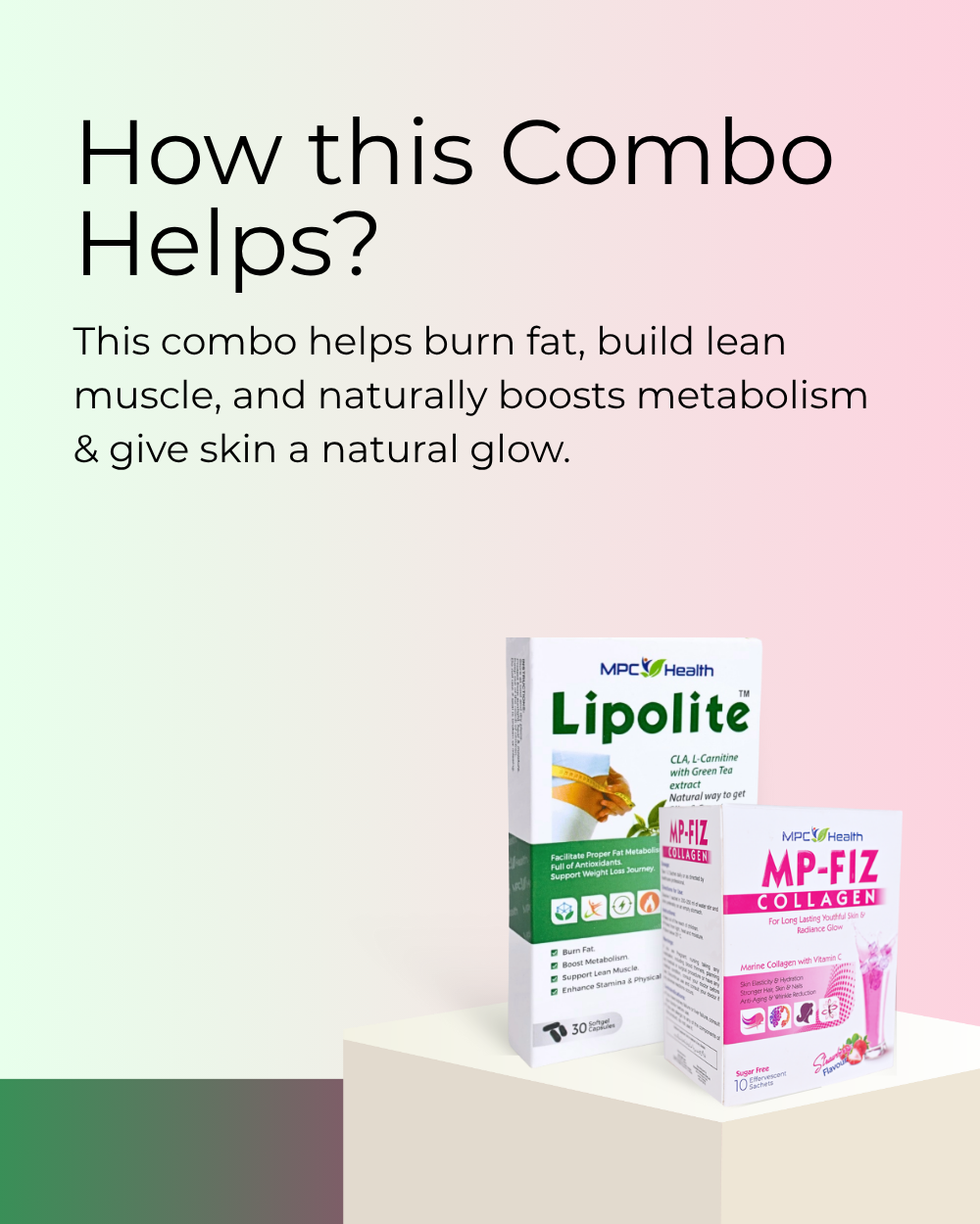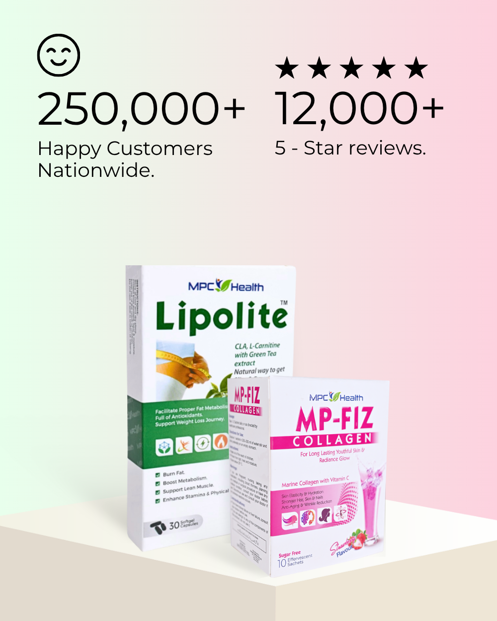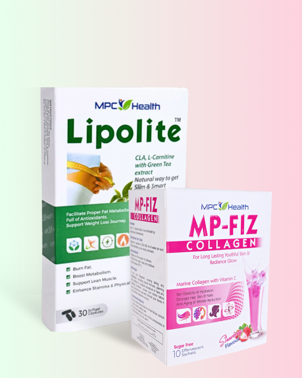 MP-Fiz Collagen works from within to hydrate, firm, and rejuvenate your skin with Marine Collagen Peptides and Vitamin C, helping restore your youthful glow. Lipolite complements it by supporting healthy metabolism and fat burning, promoting weight management and overall wellness. Together, they target beauty from every angle, boosting both your skin’s radiance and your body’s natural strength.