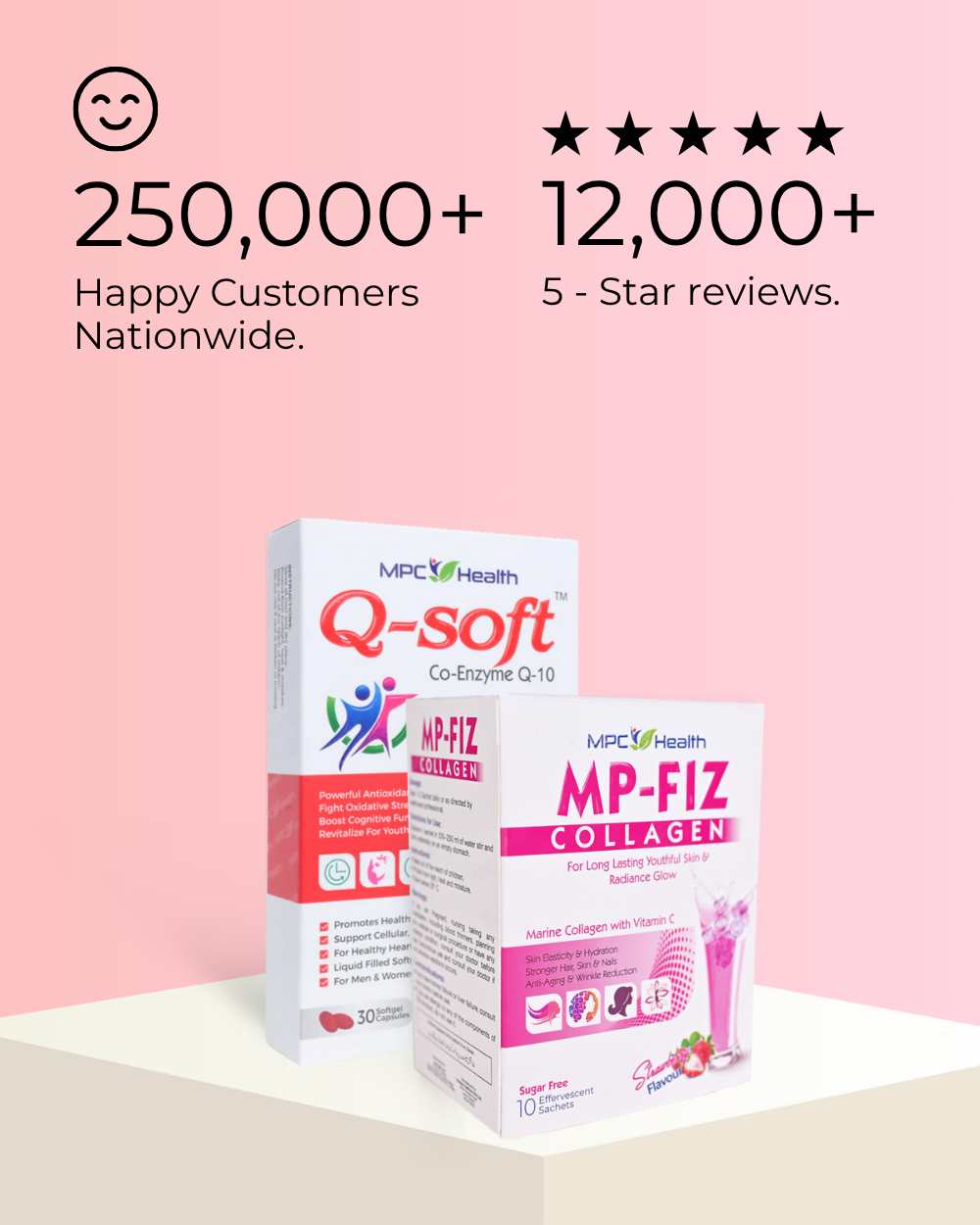 MP-Fiz Collagen boosts elasticity and firmness with Marine Collagen and Vitamin C, while Q Soft delivers deep nourishment with Vitamin E and antioxidants that protect and moisturize your skin. Together, they hydrate, repair, and protect your skin and hair, giving you a radiant, healthy glow from the inside out.